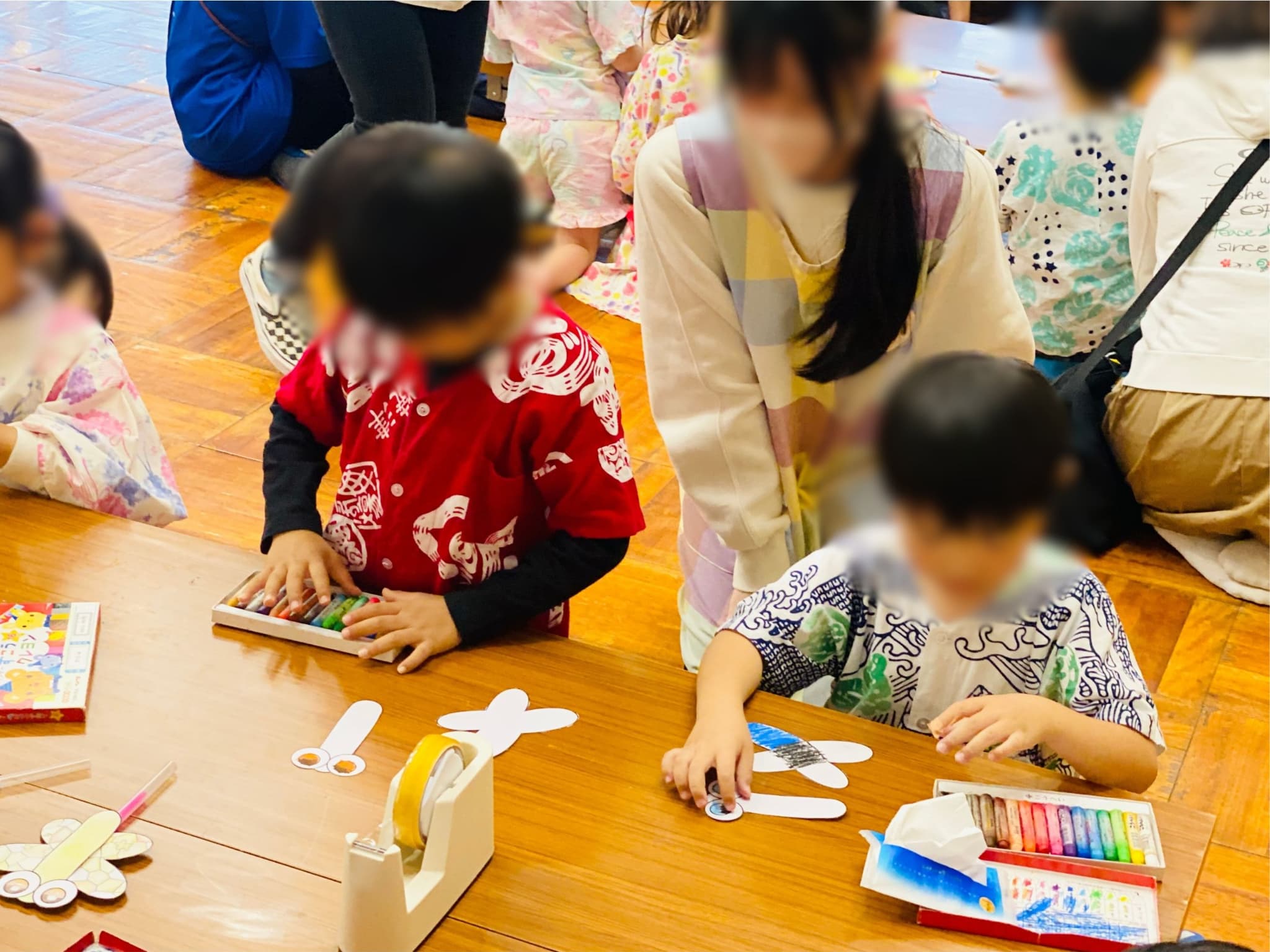 子どもたちは、予め切っておいたとんぼに、クレヨンで思い思いに色を付けたり絵を描いたりしてくれました。