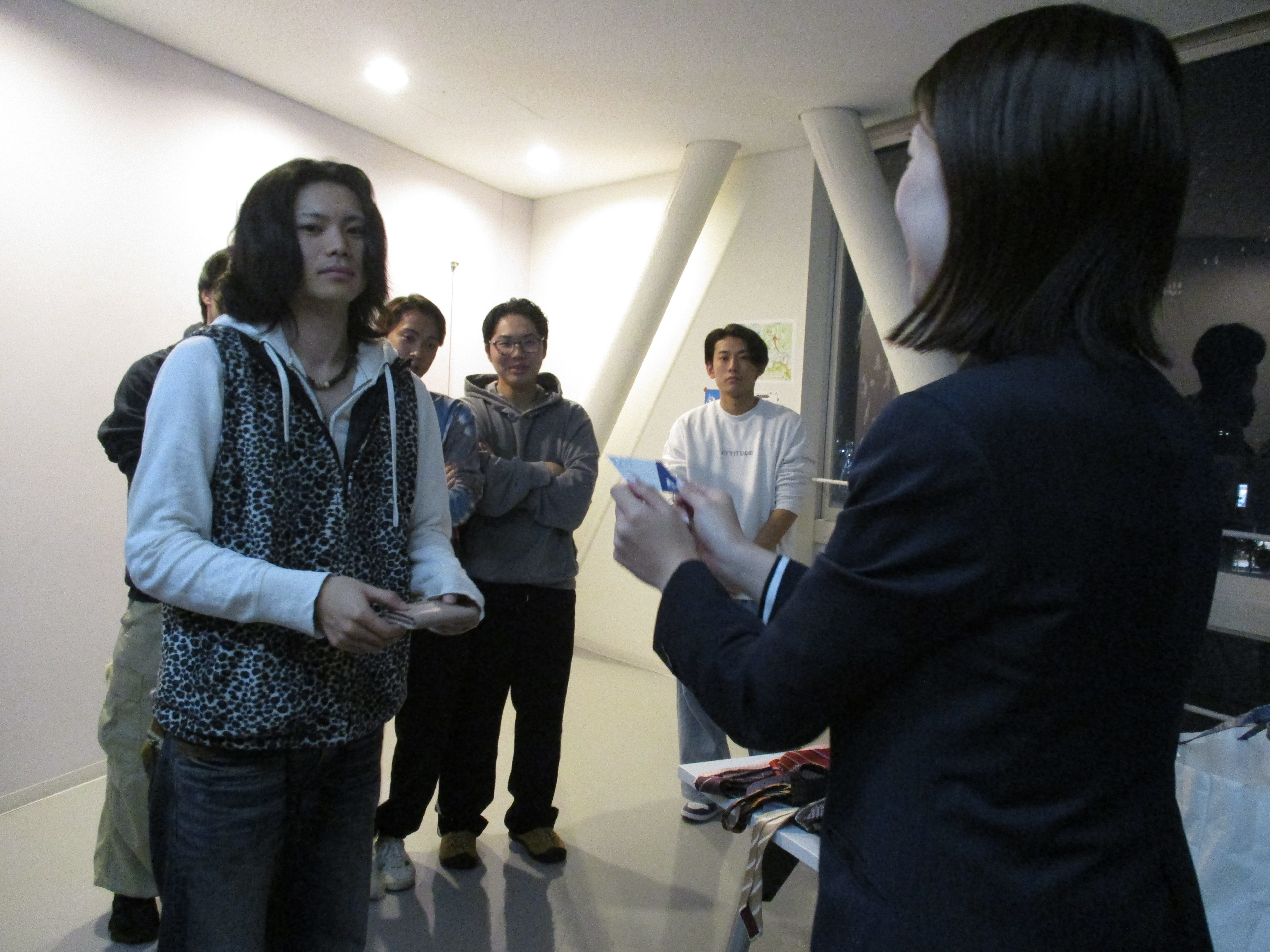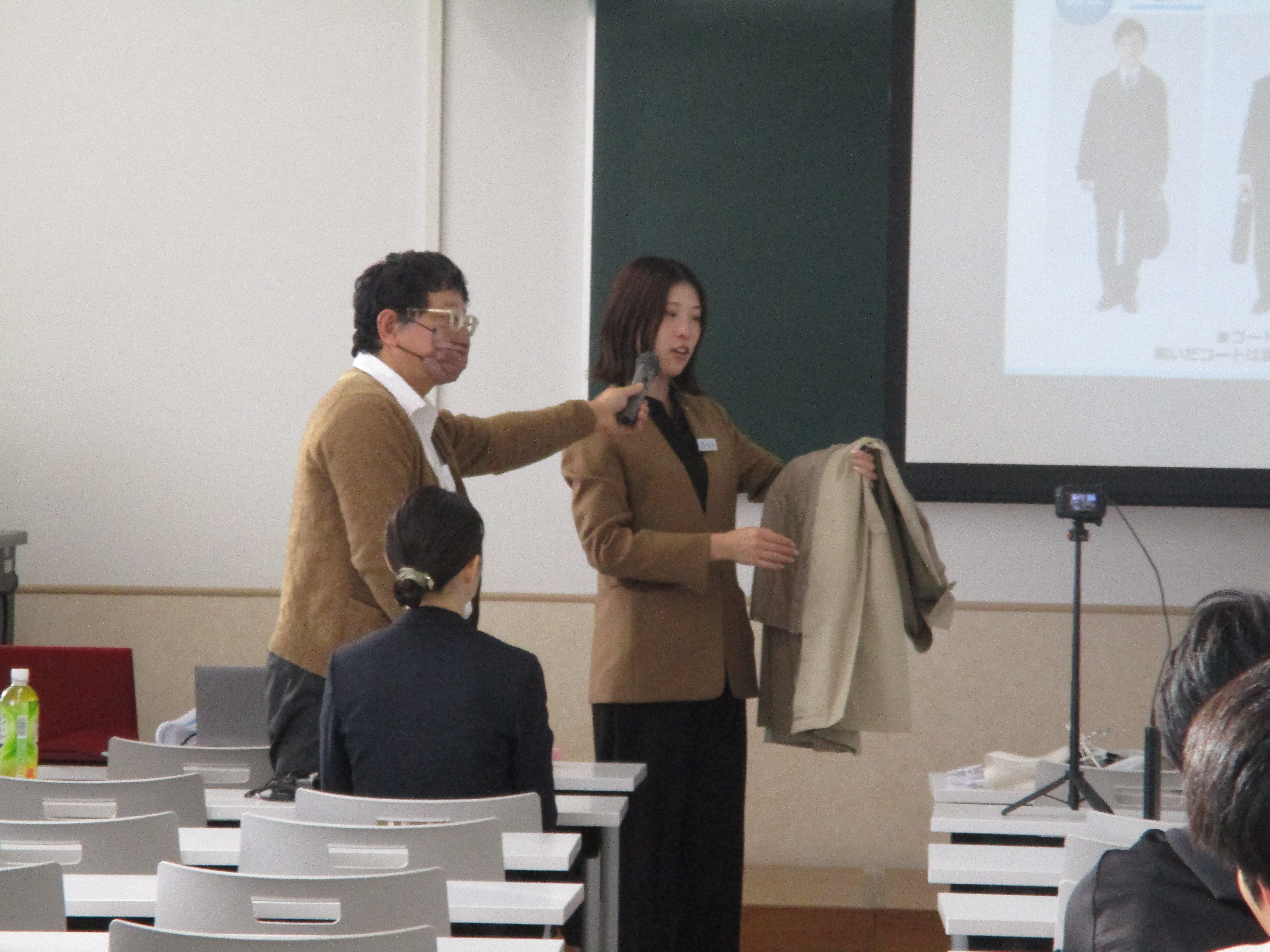 洋服の青山様には就活スーツの着こなしのポイントやスーツ・ネクタイの選び方などを教えていただきました。