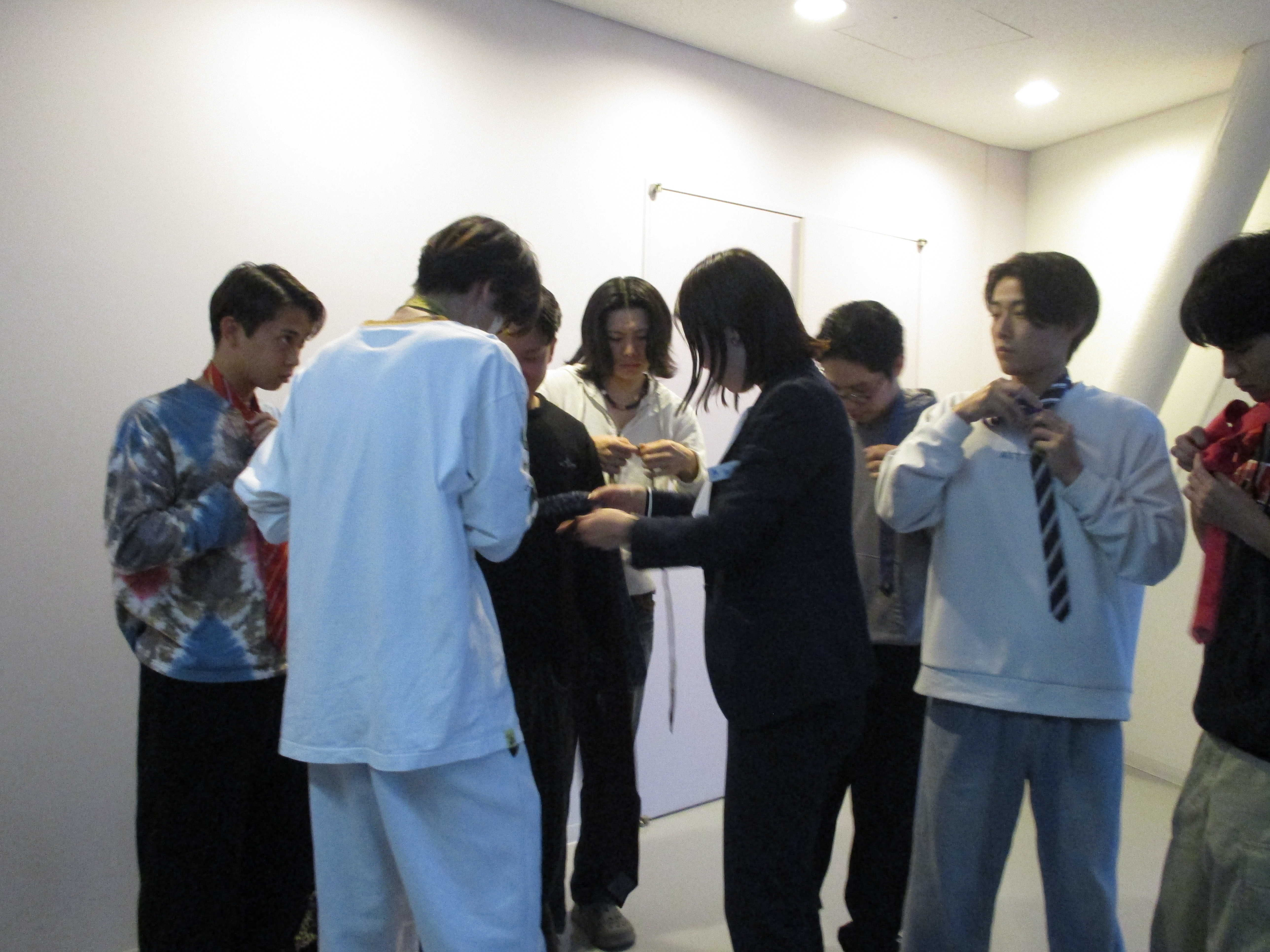 男性はネクタイの結び方を教わり、上手にできるまで何度も練習している姿が印象的でした。