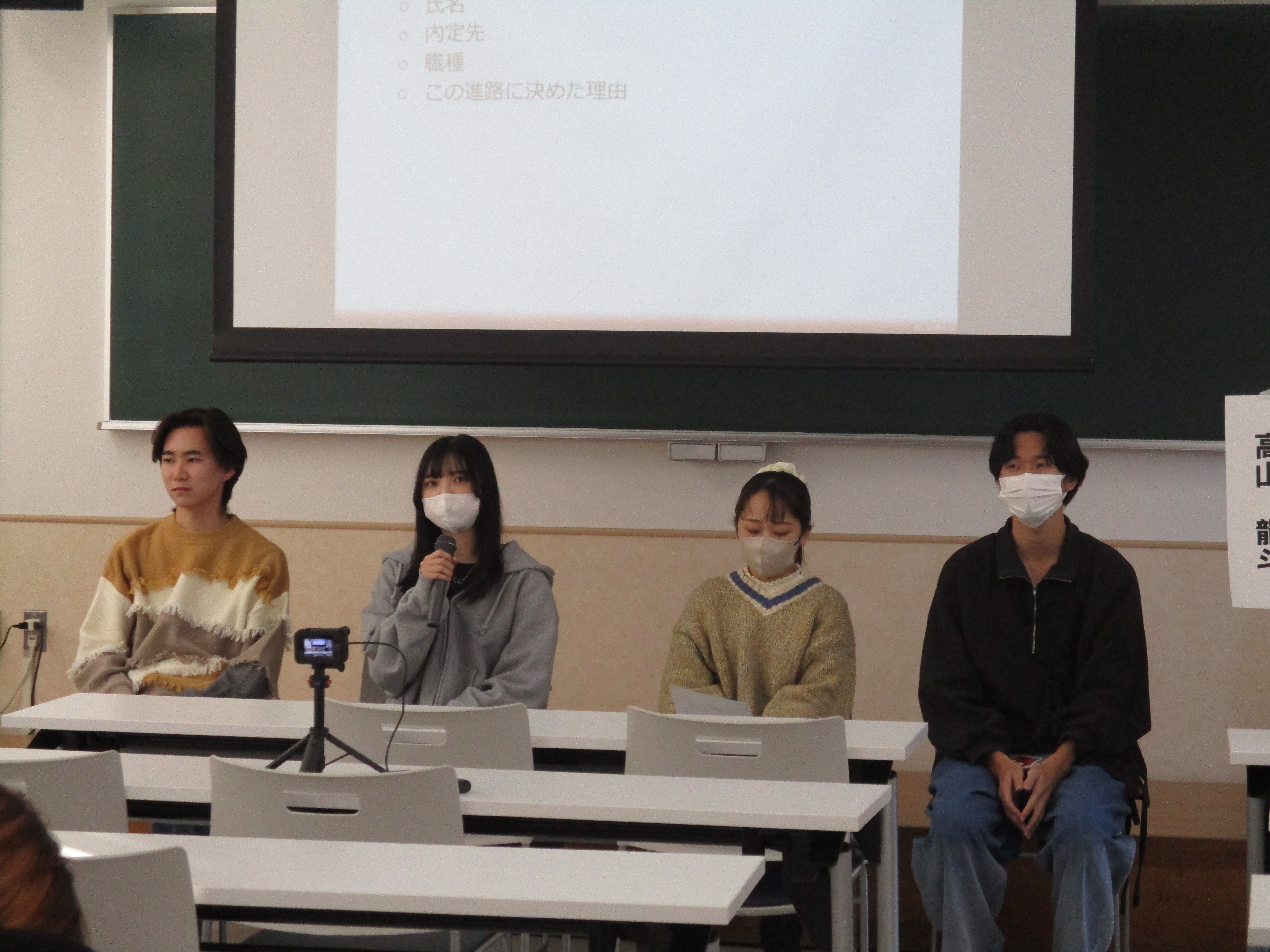 企業、福祉、公務等様々な業種や職種に内定した4年生に、内定を勝ち取るまでの成功のポイントや苦労した経験などの話をしていただきました。