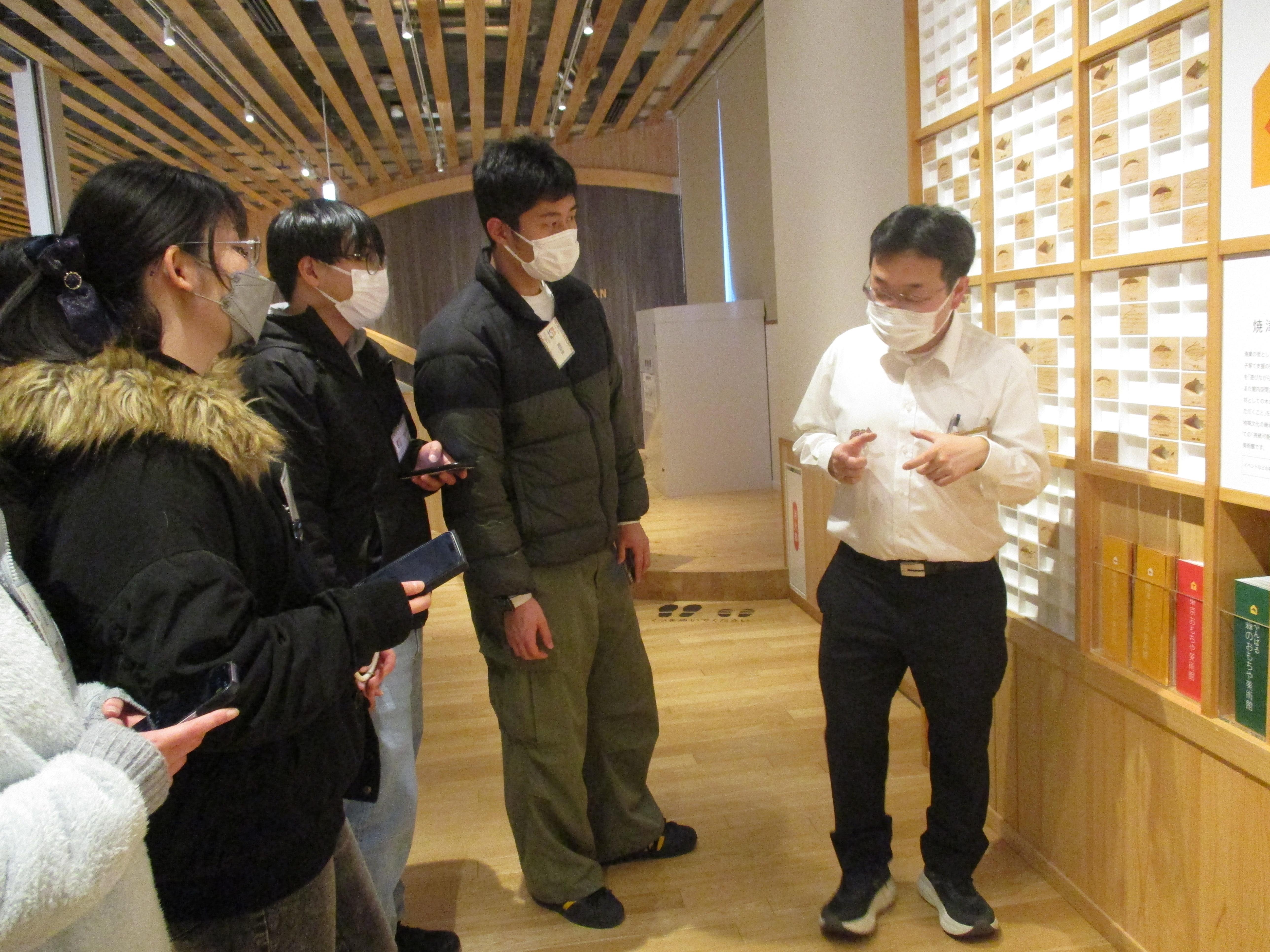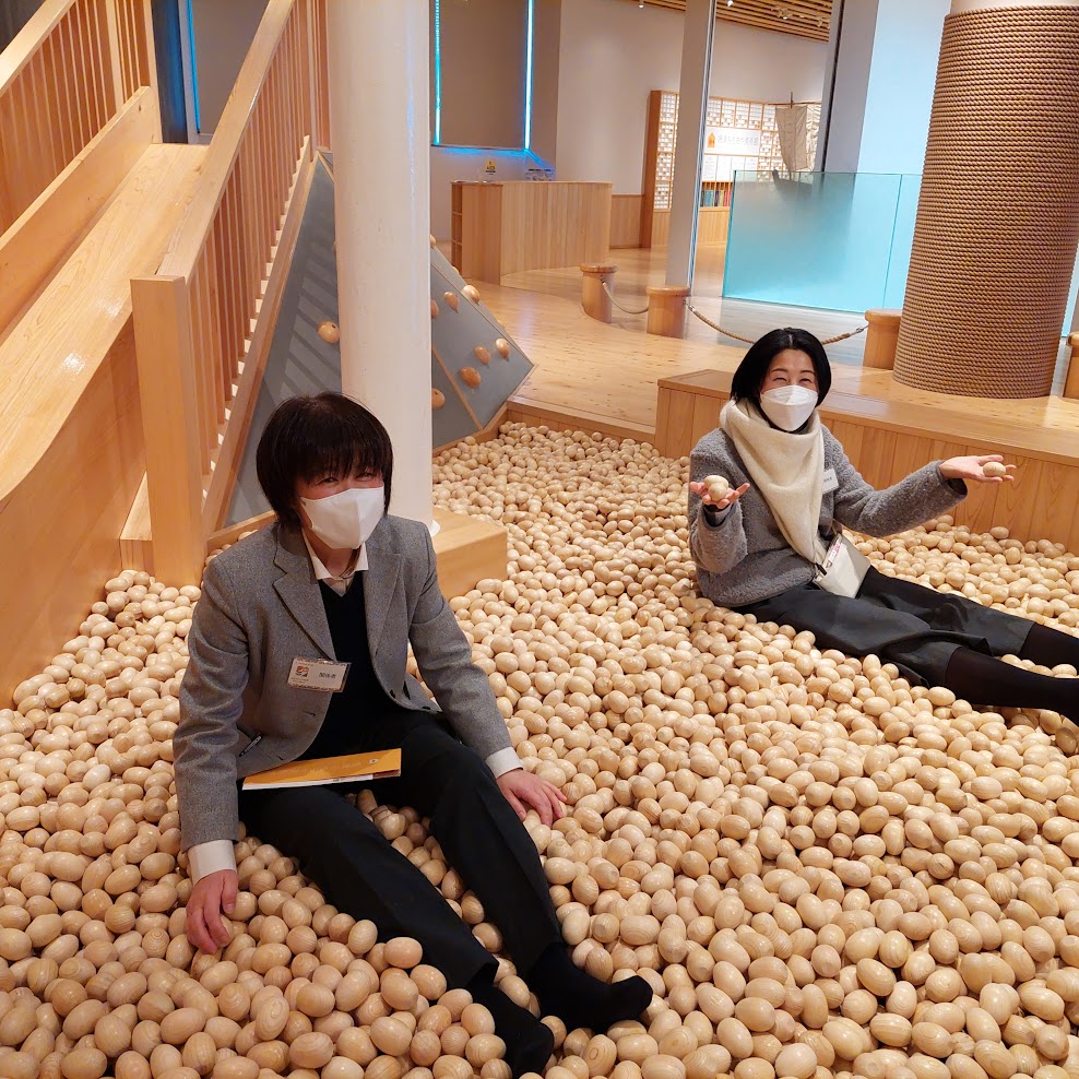 最後に訪問したターントクルこども館では、1階の絵本コーナー『やいづえほんと』と2階・3階の『焼津おもちゃ美術館』を見学させていただきました。『木のおおうなばら』など様々なコーナーには、安心して遊べる木のおもちゃがたくさんありました。学生も教職員も子どもたちに交じり童心にかえり楽しく過ごすことができました。