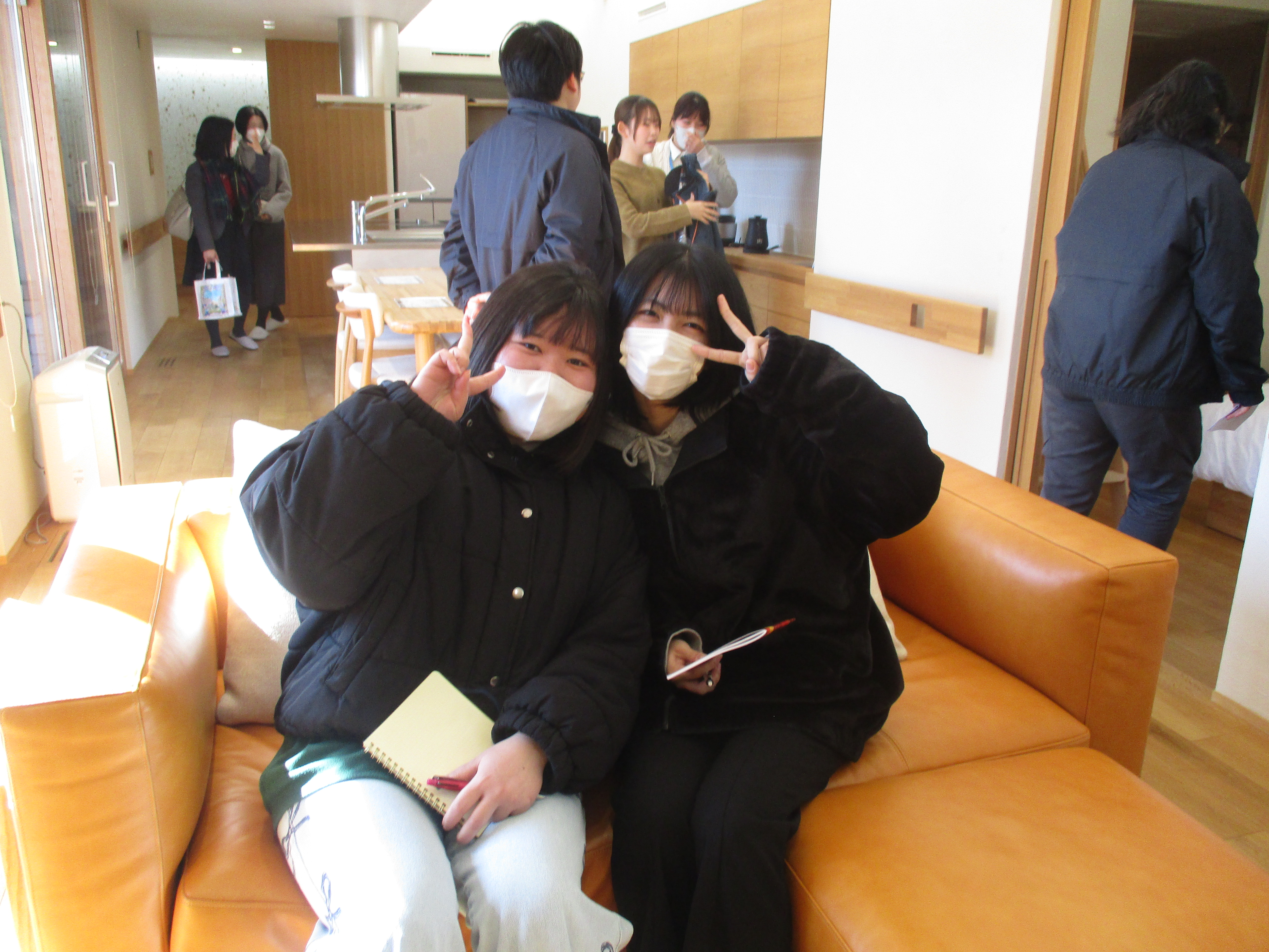最初に訪問した株式会社橋本組では新社屋を見学させていただきました。社内は外の景色がよく見渡せる吹き抜けの広々した空間でした。橋本組オリジナルのキャラクターの「ひょっこりちゃん」も登場して盛り上がりました。また、老いと向き合う住宅の建築も手掛けていて、モデルルームも見学させていただきました。生活しやすいように随所に気遣いを感じられる心温まる建物でした。地域の津波の避難地として地域貢献にも力を入れている等、建設業の橋本組の魅力をたくさん教えていただきました。